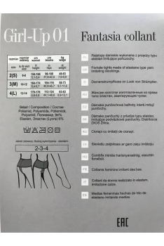 М“які еластичні колготки, що імітують панчохи під пояс з класичними рівними підтяжками спереду і ззаду. Комфортний еластичний пояс з імітацією широкого пояса 13 см, плоскі шви, гігієнічна ластка з бавовни. Одинарна обмотка нитки.