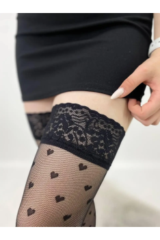 Панчохи LORES TRIESTE 20 на основі мікросіточки з сердечками, утримуються на мереживній коронці на силіконі.