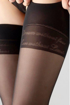 Тонкі панчохи щільністю 20 den під пояс. Особливість моделі - текстовий принт, який розміщений під гумкою панчіх. Модель панчіх має укріплений мисок, що сприяє хорошій зносостійкості. Завдяки обплетенню еластану поліамідом панчохи м“які та добре тягнуться. Довго зберігають привабливий вигляд за умови правильного догляду.